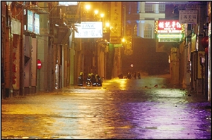 澳門(mén)沿岸海面23日現(xiàn)驚濤駭浪,漁船紛回港暫避。內(nèi)港、新馬路一帶晚上10時(shí)后出現(xiàn)海水倒灌,加上傾盆暴雨,路面最高水深至小腿。新馬路內(nèi)街出現(xiàn)水浸,電箱冒煙,大廈停電。福隆新街一帶水浸嚴(yán)重,高達(dá)1米,浸過(guò)變電站,電力公司被逼關(guān)閉電源,一帶商鋪全部被淹,料損失嚴(yán)重。