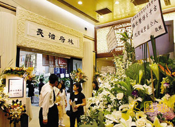 林世榮的靈堂,以金黃的慧蘭和白色百合花布置,遺孀與3名子女致送給亡夫亡父的心形花牌,花牌由黃色玫瑰造成,放于靈前當(dāng)眼處。而靈堂的橫匾,寫著“往生凈土”,左右兩側(cè)掛上大挽聯(lián)“世人贊頌一代商才,恒豐盛業(yè)傳永世”,“榮澤綿延千秋遺愛,至尊美譽葆長榮”。