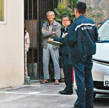 男戶主陳通美(左)走出單位協(xié)助調(diào)查。(圖片來(lái)源:蘋(píng)果日?qǐng)?bào))
