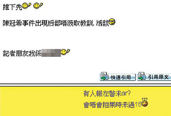 一對(duì)香港學(xué)生做愛(ài)的短片,在最少兩個(gè)網(wǎng)上討論區(qū)流傳,片段中自比為陳冠希的男受害人更被興致勃勃的網(wǎng)民“大搜索”。警方正跟進(jìn)事件,并呼吁市民舉報(bào)發(fā)布淫褻及不雅物品的元兇。