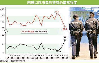廖也說(shuō):“由于市民對(duì)公務(wù)員、公職人員要求高,加上以往警方滿意度都很高,稍有行差踏錯(cuò),影響便會(huì)較大,相信在近期事件影響下,市民要一段時(shí)間才能回復(fù)信心!