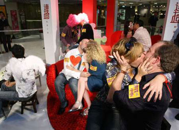 在鎂光燈的閃爍下,五對(duì)來(lái)自不同國(guó)家的情侶,坐上獨(dú)特的“愛(ài)情連椅”,他們要在眾目睽睽下,用各異的方式吻自己的愛(ài)侶,持續(xù)2分14秒。圍觀市民大感興趣,摒住呼吸觀賞現(xiàn)場(chǎng)的熱吻。