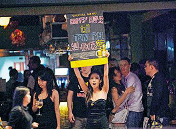 金融海嘯令香港酒吧生意一落千丈,美國軍艦這次訪港,預(yù)計(jì)會帶旺尖沙咀、灣仔及銅鑼灣一帶的消費(fèi),特別為區(qū)內(nèi)的酒吧帶來“及時雨”。不少酒吧東主得悉有大批美軍抵港,如久旱逢甘露,有酒吧更在門外掛上美國國旗作招徠,而大批衣著性感女郎,比平時更早“開工”,未及黃昏已經(jīng)在街頭向途經(jīng)大兵拋媚眼。