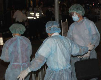 5日晚約9時,一輛救護車停泊在維景酒店門外,1名穿上“全副武裝”保護衣的醫(yī)護人員進入酒店,準備接走2名墨西哥人往機場。