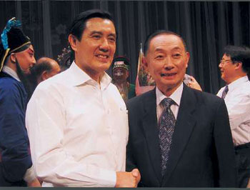 圖:馬英九觀看梅派名劇后上臺與梅葆玖握手。(圖片來源:大公報)