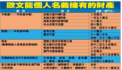 據(jù)澳門(mén)日?qǐng)?bào)報(bào)道,澳門(mén)廉署首席調(diào)查員馮伯恩經(jīng)法庭批準(zhǔn),透過(guò)計(jì)算機(jī)輔助披露歐文龍以個(gè)人名義及透過(guò)家人擁有的財(cái)產(chǎn)。歐文龍財(cái)產(chǎn)中,主要由動(dòng)產(chǎn)、不動(dòng)產(chǎn)、有價(jià)值物品及澳門(mén)銀行存款組成,從物業(yè)登記處數(shù)據(jù)以及廉署在歐文龍司長(zhǎng)辦公室、官邸及銀行保險(xiǎn)箱中搜獲的現(xiàn)金,涉及的款項(xiàng)逾一億元。