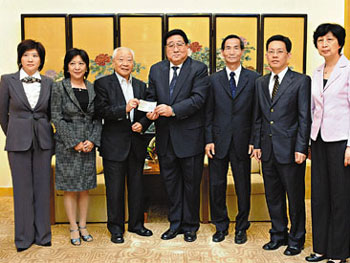 李東海基金有限公司15日慨捐1000萬,由李東海與兒子李君豪一起遞交了善款支票。 有近8年時間住在四川的香港知名工業(yè)家蔣震,在兩個女兒陪同下到中聯(lián)辦捐出1000萬元的支票。
