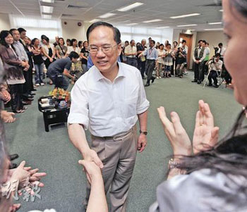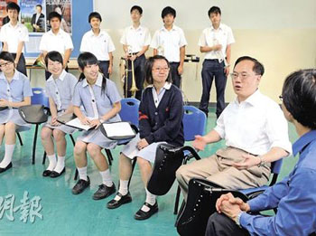 曾蔭權(quán)(右)與家長(zhǎng)及學(xué)生就教育問(wèn)題交換意見(jiàn)。(圖片來(lái)源:明報(bào))