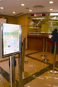 圖:銀行設(shè)置“現(xiàn)金分享計(jì)劃”兌票專窗。(圖片來源:澳門日?qǐng)?bào))