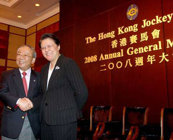 馬會(huì)4日舉行會(huì)員周年大會(huì),遴選會(huì)員選出一名新任董事,另外5位董事獲選連任,F(xiàn)任董事郭勤功今年10月將屆70歲,因此決定退任。大會(huì)后,范徐麗泰獲選填補(bǔ)因郭勤功退休而騰出的空缺,任期2年。同時(shí),陳祖澤和施文信分別獲連任馬會(huì)2008至2009年度主席及副主席之職。