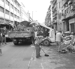 清潔工人利用大型機(jī)械及車輛移走垃圾。(圖片來(lái)源:澳門日?qǐng)?bào))