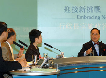 曾蔭權(quán)重申,特區(qū)政府堅(jiān)持“大市場、小政府”的原則,但金融市場有需要時(shí),特區(qū)政府必定采取快而準(zhǔn)、到位及夠力度的行動(dòng),但沒有需要時(shí),特區(qū)政府必定退出。