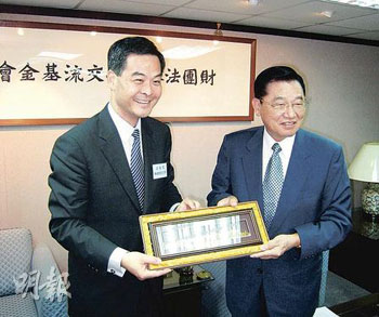 梁振英以香港專業(yè)聯(lián)盟主席身分,率領港交所、貿發(fā)局、國際仲裁中心等18名經(jīng)貿專業(yè)人士組團訪臺,23日拜會“陸委會”、;鶗、工業(yè)總會、商業(yè)總會,由;鶗麻L江丙坤、“陸委會”副主委劉德勛接見。