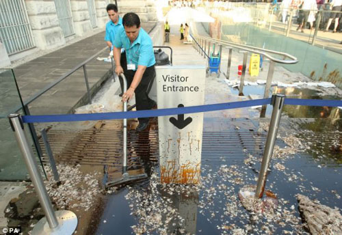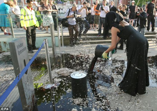 抗議者選擇泰德美術(shù)館開(kāi)夏日聚會(huì)的時(shí)候,來(lái)到美術(shù)館門(mén)口表達(dá)自己的不滿(mǎn),呼吁美術(shù)館盡快停止接受贊助。一些人手持印有BP字樣的原油桶,往美術(shù)館入口處的空地上潑灑石油和羽毛。頓時(shí)美術(shù)館門(mén)口滿(mǎn)眼狼籍,吸引了很多的過(guò)路人。
