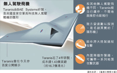 該無人駕駛飛機名為Taranis,是雷電之神的名字。Taranis由BAE Systems聯同Qinetiq、勞斯萊斯和GE Aviation花了4年時間研制,成本達1.43億英鎊,將于明年作飛行測試。