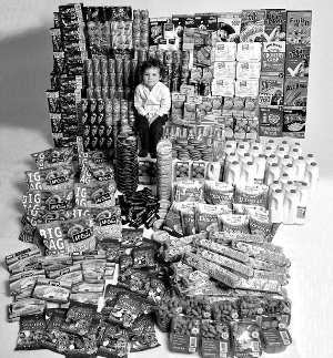 12日,英國媒體刊登了一份英國食品標(biāo)準(zhǔn)機構(gòu)和營養(yǎng)調(diào)查機構(gòu)共同統(tǒng)計的數(shù)據(jù),數(shù)據(jù)統(tǒng)計了4到10歲兒童平均每人一年內(nèi)所食用的包括蛋糕、冰激凌等在內(nèi)的“垃圾食品”的數(shù)量,并將所有這些放在一起拍了張照片。據(jù)統(tǒng)計每名兒童一年平均吃5840克餅干、8030克蛋糕、4380克奶酪、5840克冰激凌等。(綜合)