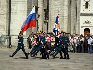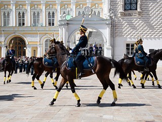 自2005年起,在氣候轉(zhuǎn)暖的4-10月,每逢周六中午克里姆林宮前就會進行總統(tǒng)衛(wèi)隊步兵和騎兵的換崗儀式。其中,每月的前三個周六在克里姆林宮廣場進行,剩下的在紅場進行。(梁旭)