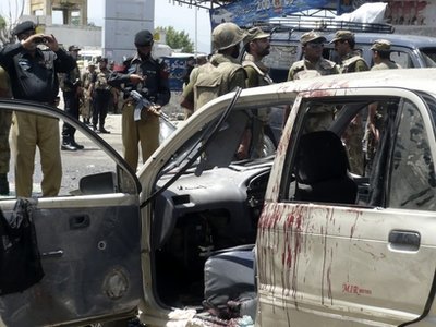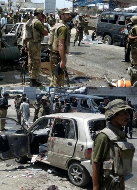 巴基斯坦媒體電視畫面顯示,爆炸導致附近汽車扭曲變形,民眾正在試圖營救2名被困在車中,滿臉鮮血的人。