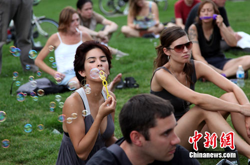 中新社多倫多7月17日電 (記者 賴海隆)數(shù)百名攜帶吹氣泡用品的抗議者17日正午時分在多倫多皇后公園里同時吹出氣泡,以表達對“氣泡警官”喬瑟夫斯憤怒,以及對G20峰會期間警方行為的公眾調(diào)查的支持。