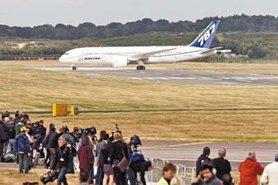 中新網(wǎng)7月19日電 綜合外電報(bào)道,倍受矚目的波音"787夢(mèng)想客機(jī)"18日在英國(guó)范堡羅航空展首次亮相。這架美國(guó)制造的新型客機(jī)當(dāng)天降落在英國(guó),完成首次在美國(guó)以外的飛行之旅。