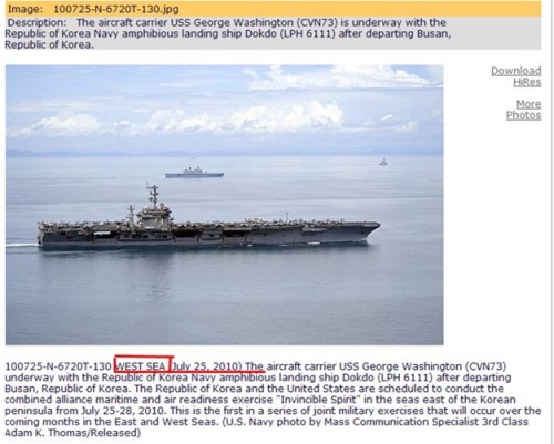 記者于7月28日再次登錄美國(guó)海軍官方網(wǎng)站,發(fā)現(xiàn)之前被標(biāo)為拍攝于“西!(中國(guó)稱“黃海”)并在7月27日被刪除的照片,已經(jīng)再度被上傳到網(wǎng)站上,而其標(biāo)注的地點(diǎn)已經(jīng)被更正為“日本海”。