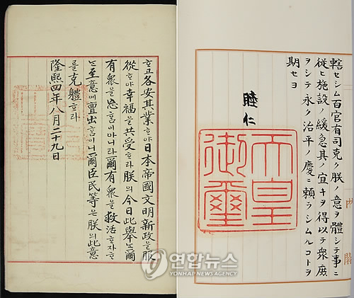 韓聯(lián)社10日通過首爾大學(xué)名譽(yù)教授李泰鎮(zhèn)掌握到日方韓日合并條約詔書照片,圖中可以看到,1910年8月29日日本天皇公布韓日合并的詔書上印有天皇御璽,署名“睦仁”。