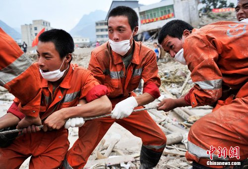 災(zāi)害發(fā)生后,救援人員和當(dāng)?shù)厝罕娫诰d延災(zāi)區(qū)兩公里多的廢墟上展開搜救,許多當(dāng)?shù)厝罕娛褂苗P子、鋤頭及繩索等工具營(yíng)救被困同胞。