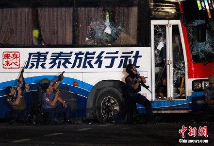 另據(jù)報(bào)道,在菲律賓馬尼拉挾持香港旅行團(tuán)的槍手,與警方對(duì)峙約9小時(shí)后,于23日晚間被擊斃。電視畫面顯示,槍手尸體掛在旅游巴士破損的前門上。