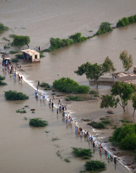 洪水已經(jīng)淹沒(méi)了巴基斯坦三分之一的土地,援助物資依然極為匱乏,工程師們經(jīng)常需要面對(duì)將洪水引向何方的困難抉擇。毀掉堤壩是控制洪水水位最常用的方式之一,謹(jǐn)慎行事可以減小洪災(zāi)的影響。可是,一些報(bào)道稱(chēng),旁遮普省Muzaffargarh地區(qū)的地方官員迫使工程師將洪水引向人口密集區(qū),而避開(kāi)更小、更富裕的地區(qū)。