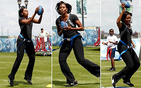 現(xiàn)在,這位備受關(guān)注的第一夫人又以身作則,她加入到由印第安納波利斯小馬隊教練托尼·唐奇、前坦帕灣海盜隊線衛(wèi)德里克·布魯克斯等橄欖球明星發(fā)起的旨在倡導(dǎo)青少年健康生活的美式橄欖球運(yùn)動,在學(xué)生們面前大展她運(yùn)動的天賦。