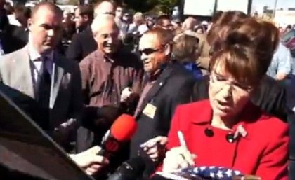 佩林在出席集會時,支持者遞給她帽子、球衣和書籍以獲得簽名。而當有人遞上國旗時,她也毫不猶豫的用記號筆在旗面上揮筆寫下自己的名字,而后還揮動國旗并將其送還給支持者。