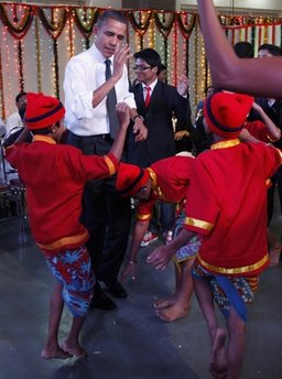 這些身穿鮮艷印度傳統(tǒng)服裝的孟買學生,當天為遠道而來的客人表演慶祝排燈節(jié)的舞蹈,他們搖擺著身姿,配以優(yōu)美的手勢,感染著在場的觀眾。孩子們邀請奧巴馬夫人米歇爾一起舞蹈,米歇爾熱情的加入,奧巴馬則在一旁靜靜觀看。不過最后,奧巴馬也被拉起來共舞,但有些呆板生硬的動作令人忍俊不禁。