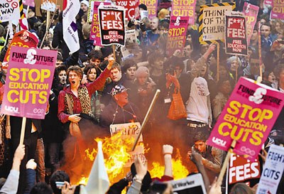 中新網(wǎng)11月12日電 據(jù)香港《文匯報(bào)》12日?qǐng)?bào)道,英國10日爆發(fā)首場反對(duì)財(cái)政緊縮措施的暴力示威,5萬名學(xué)生在首都倫敦上街抗議,反對(duì)政府削減教育開支,并大幅上調(diào)每年學(xué)費(fèi)至9000英鎊(約合9.6萬元人民幣),是現(xiàn)水平的3倍。后來,示威演變成暴力沖突,部分人沖進(jìn)保守黨總部大樓,破壞接待處和大堂,有人從天臺(tái)投擲雜物。事件中有14人受傷,32人被捕。首相卡梅倫譴責(zé)了此次事件,稱不能接受暴力行為。