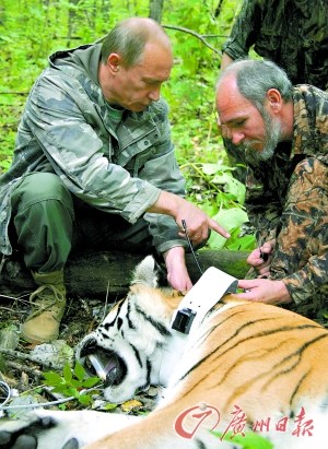 俄羅斯總理普京曾于2008年9月在西伯利亞虎保護(hù)區(qū),用麻醉槍擊中一頭西伯利亞成年雌虎。圖為普京親手給這頭昏睡的老虎戴上電子追蹤項(xiàng)圈。