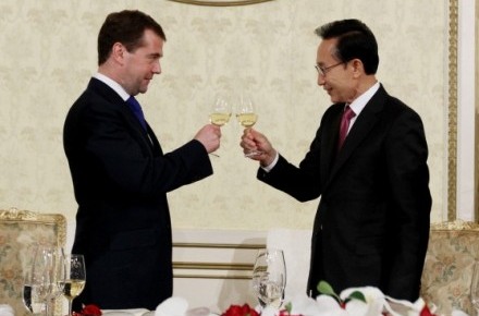 俄韓兩國經(jīng)濟互動近年來大幅改善,尤其是在高技術交流領域。韓國貿易協(xié)會最新數(shù)據(jù)顯示,2010年前9個月雙邊貿易達到124億美元,較2009年全年增加兩成。而梅德韋杰夫則預估,俄韓雙邊貿易量將突破170億美元。