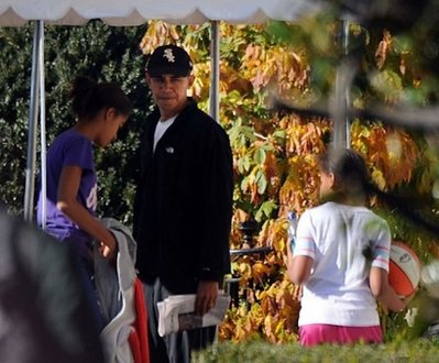 中新網(wǎng)11月29日電 據(jù)外電報(bào)道,當(dāng)?shù)貢r間28日,不久前遭肘擊、嘴唇因此縫了12針的美國總統(tǒng)奧巴馬又重回籃球場打球,不過,這次他和兩個個子小了許多的對手——他的兩個女兒上場。相信這次,他不會再“破相”了。