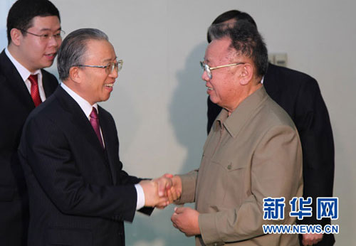 朝鮮勞動(dòng)黨總書(shū)記、國(guó)防委員會(huì)委員長(zhǎng)金正日9日在平壤會(huì)見(jiàn)了國(guó)務(wù)委員戴秉國(guó)。