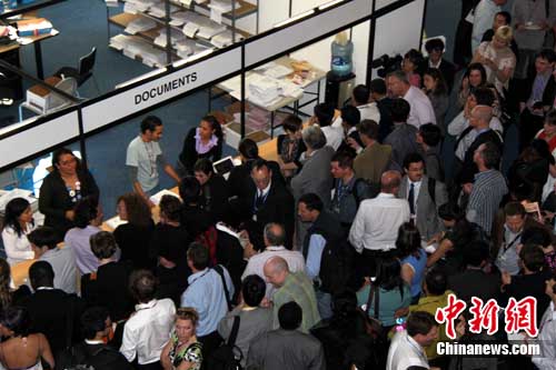 中新社記者現(xiàn)場目擊,在文件發(fā)放處排起了很長的隊伍,廣大與會者特別是談判代表都希望先睹為快。文件發(fā)放處前人潮洶涌,多名聯(lián)合國警察被調(diào)往現(xiàn)場維持秩序。