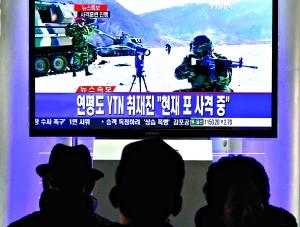 韓國(guó)各界對(duì)軍方舉行射擊訓(xùn)練的消息十分關(guān)注。街頭公共電視屏幕前擠滿了觀眾。