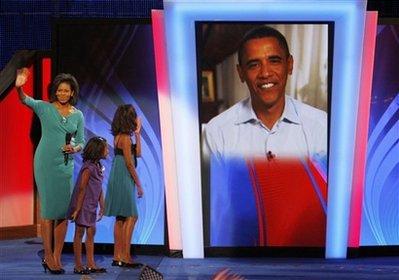 奧巴馬的兩個女兒莎夏和瑪麗亞在他們的母親演講完之后走上臺,大廳內(nèi)揚起Stevie Wonder唱的《瞧她們多可愛》的歌聲。