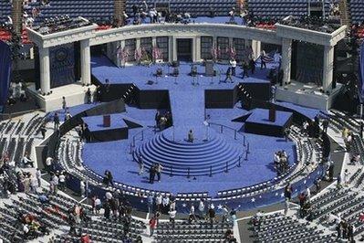 奧巴馬發(fā)表演說前,女演員Jennifer Hudson將演唱國歌,還有繞舌歌手will.i.am、歌手Sheryl Crow等演唱,星光熠熠。當(dāng)奧巴馬出場(chǎng)時(shí),臺(tái)上將大灑彩紙,并圍繞球場(chǎng)四周放煙花。
