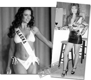 據(jù)稱是佩林參加“阿拉斯加小姐”選美時(shí)的比基尼照和一張身著超短裙照片。