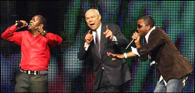 美國前國務(wù)卿科林·鮑威爾在一場以援助非洲為主題的演唱會上即興上演了一段嘻哈舞蹈,現(xiàn)場觀眾熱烈歡呼。