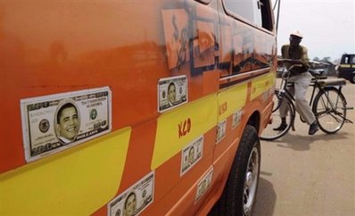 肯尼亞基蘇木一輛貼滿奧巴馬宣傳畫的小貨車。
