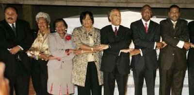 馬丁路德金的家人們在大選日晚聚集在馬丁路德金生前主禮的浸信會教堂前。