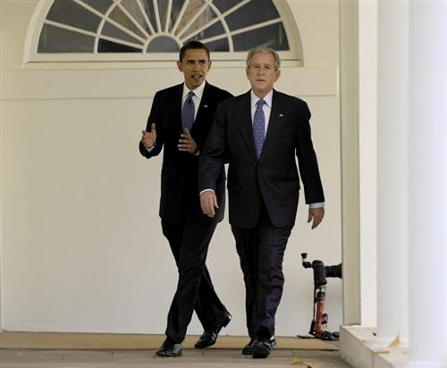 今天的白宮附近戒備森嚴(yán),剛當(dāng)選為下任美國總統(tǒng)的奧巴馬今天下午來到白宮訪問。抵達(dá)白宮后,奧巴馬與現(xiàn)任總統(tǒng)布什相互握手,然后一同步入橢圓型總統(tǒng)辦公室。據(jù)當(dāng)?shù)孛襟w報道說,會見中兩人就一系列問題展開了討論,其中包括金融危機、伊拉克戰(zhàn)爭等難題。雙方還就白宮權(quán)力移交議題進(jìn)行了商議。在布什與奧巴馬舉行會談的同時,布什夫人勞拉·布什陪伴著未來的第一夫人米歇爾·奧巴馬在白宮走動參觀。