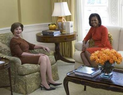 中新網(wǎng)11月11日電 據(jù)星島環(huán)球網(wǎng)報(bào)道,美國準(zhǔn)第一夫人米歇爾10日隨同候任總統(tǒng)丈夫奧巴馬到訪白宮,趁著丈夫與總統(tǒng)布什進(jìn)行會(huì)談的時(shí)候,在白宮范圍內(nèi)到處逛逛看看,包括參觀他們一家兩個(gè)多月后便會(huì)入住的白宮行政大樓33個(gè)房間。為她充當(dāng)向?qū)У,是已?jīng)在白宮住了8年的現(xiàn)任第一夫人勞拉。