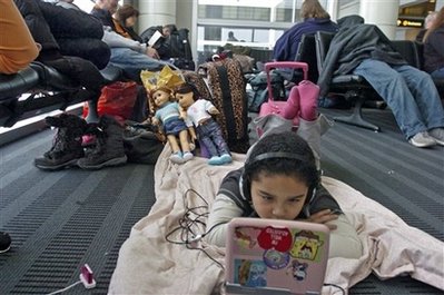 21日,7歲的凡妮莎在西雅圖塔科馬國際機(jī)場等待因風(fēng)雪延誤的班機(jī)。