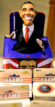 自當選總統(tǒng)的那一刻起,奧巴馬就成了商家的“搖錢樹”。隨著支持他的呼聲越來越高,各種以他為原型的商品層出不窮。T恤、籃球、棒球帽、戒指、鑰匙扣、筆、杯子應有盡有。在大街小巷,隨處可以看到和奧巴馬有關的小物品,諸如香煙、拳擊短褲、熱狗、高爾夫球、唇膏、腕表等,各色各樣,琳瑯滿目。