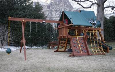 這套木制滑梯、秋千及攀爬套裝,是由美國紅木及香柏木所制,由南達(dá)科他州一間公司制造,符合奧巴馬推動的環(huán)保政策原則。暫時未悉這個迷你游樂場花了多少錢建造。